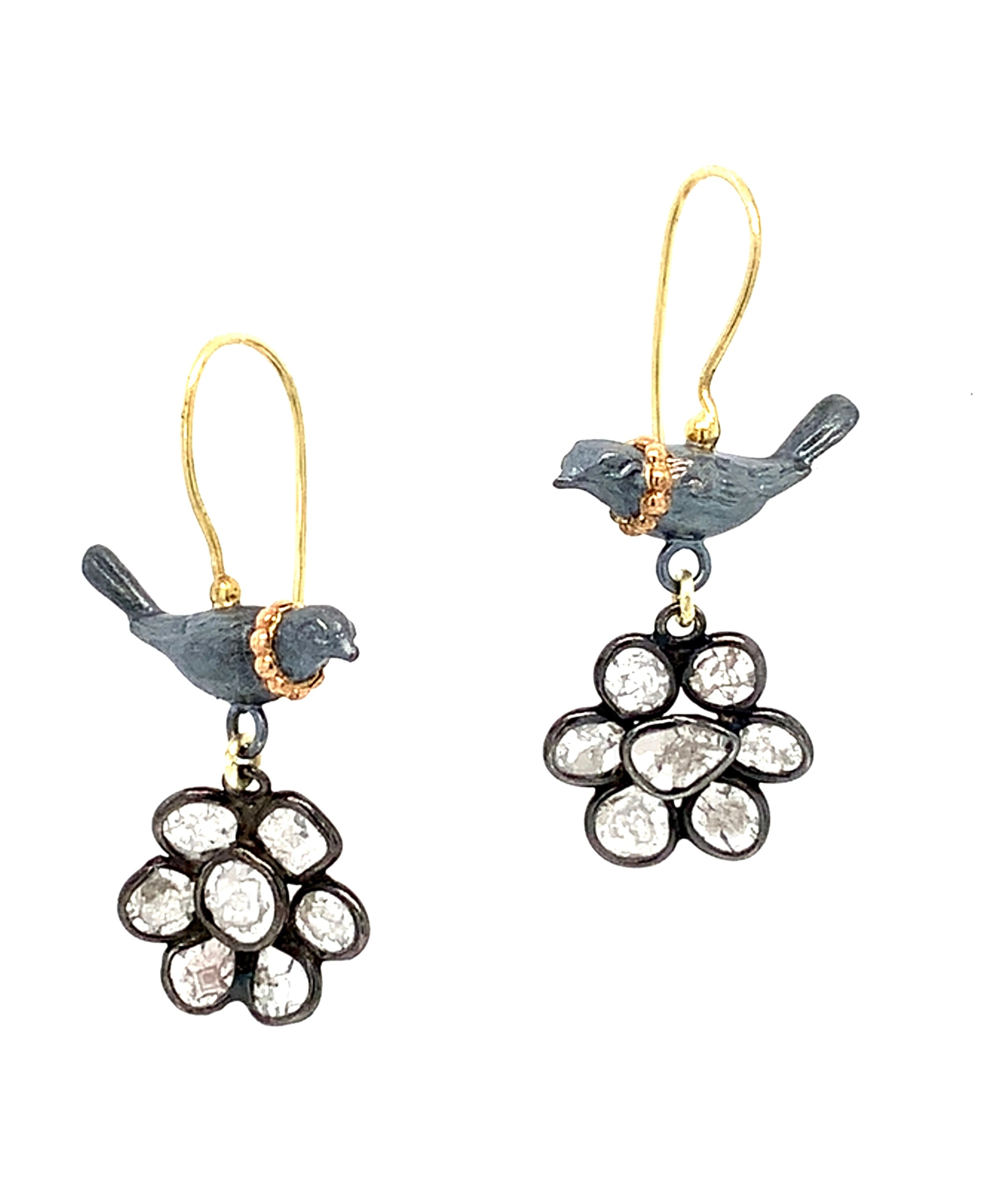 Crafted from oxidized silver and 14k gold, these elegant earrings feature delicate diamond-sliced flowers, bringing a refined, artful touch to any ensemble.