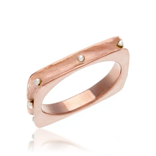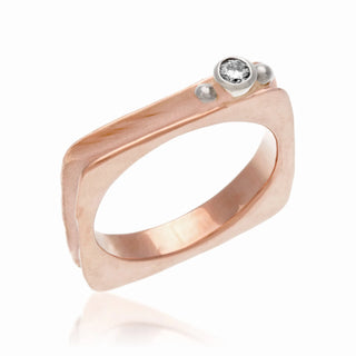 Square 14k pink gold square stack with 8 pt diamond set in 14k white gold and 2 - 14k white gold balls