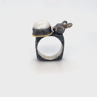 9mm Wide band, 14k white gold, 18k yellow gold balls, 6-3pt diamonds set in 18 k yellow