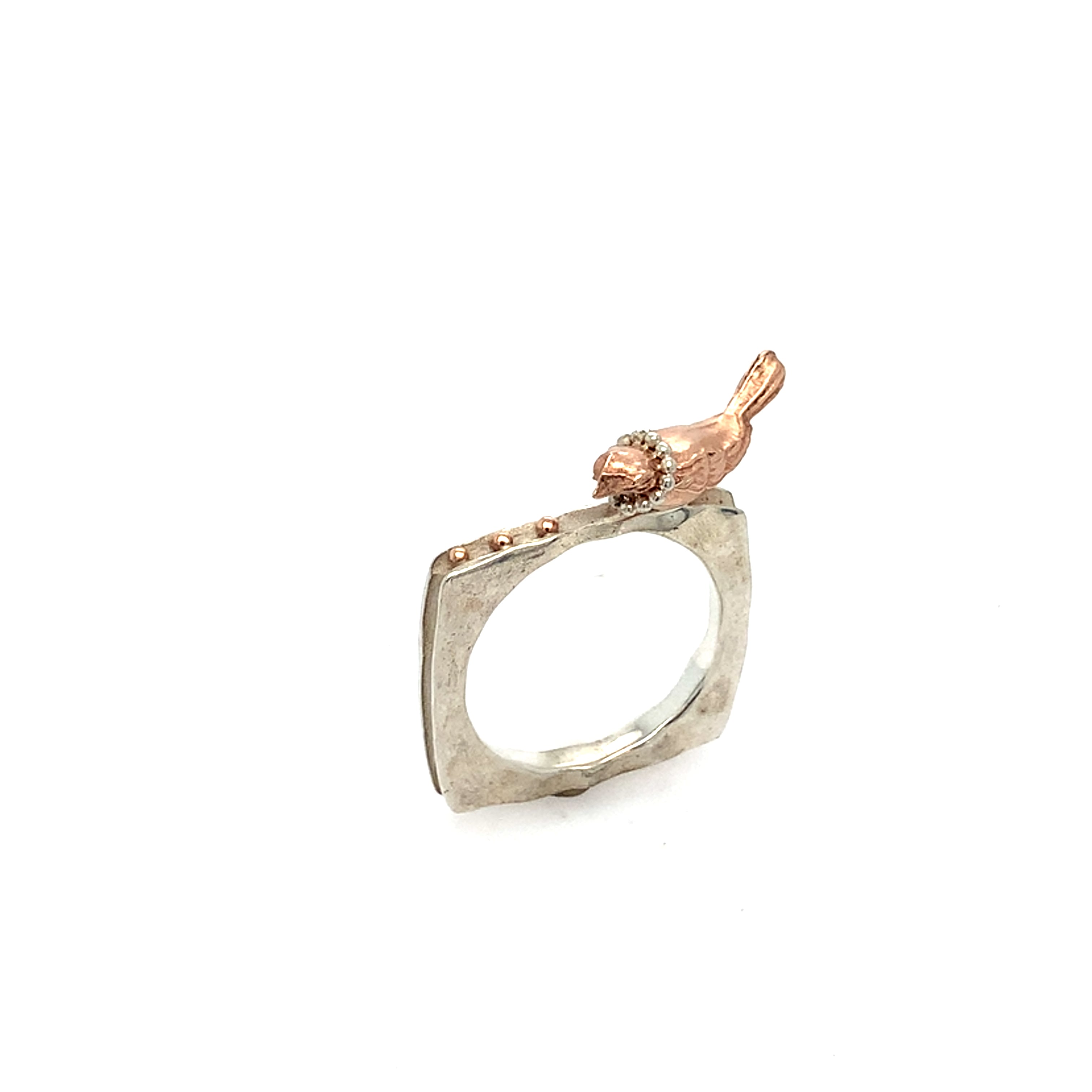 This elegant square ring features a delicate 14k pink gold bird angled gracefully with a sterling silver necklace alongside polished pink gold balls. Its refined design combines modern geometry with subtle natural motifs.